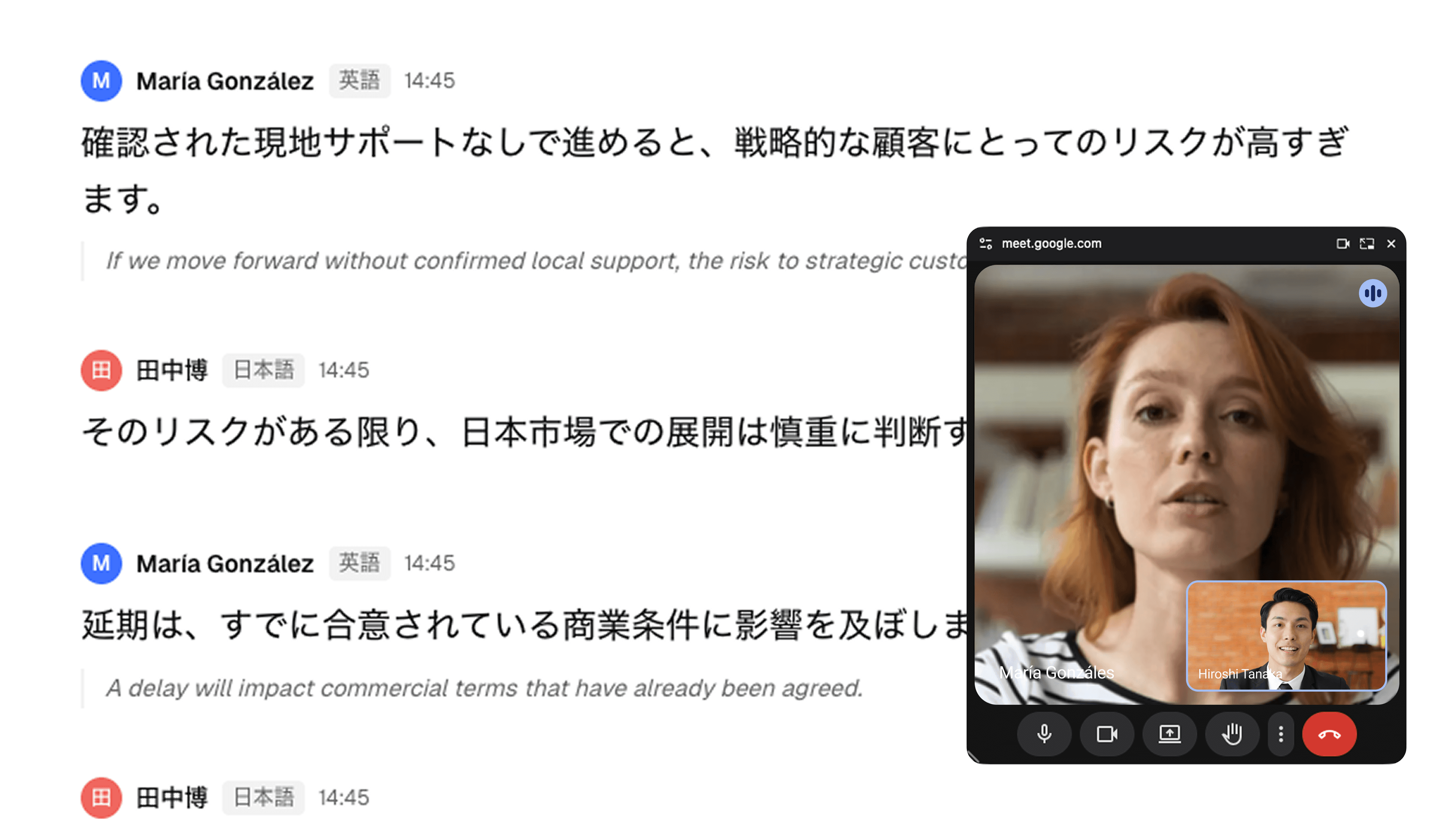 As you speak, each participant sees real-time captions and translation in their own language—simultaneously. No switching, no delays, no loss of nuance.